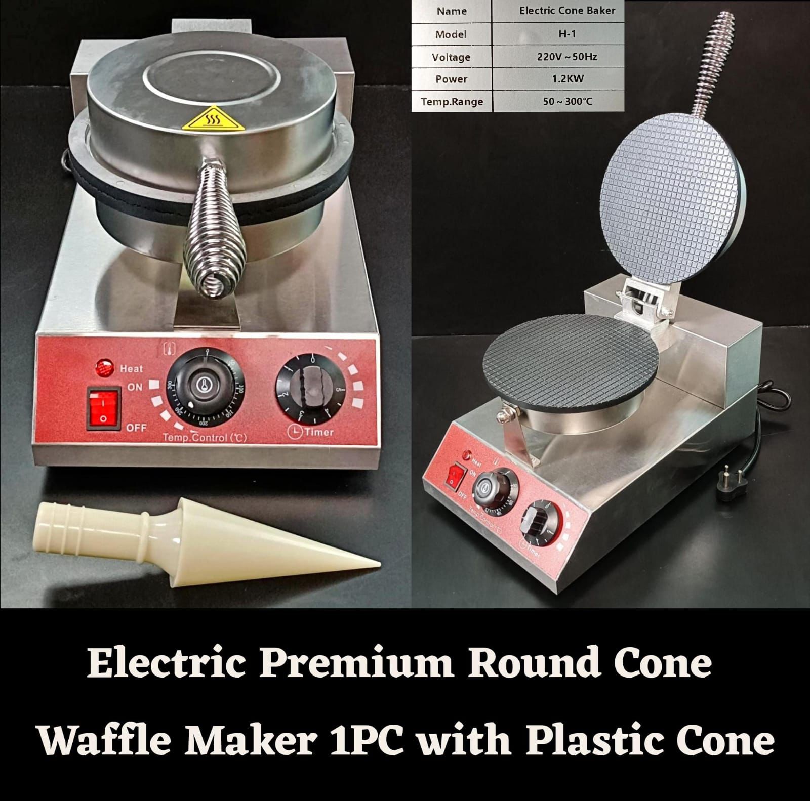 + Free ShippingCreate crispy and perfectly shaped cone waffles with the Electric Premium Round Cone Waffle Maker. Designed for professional use, it includes 1 plastic cone mold for easy shaping and features 1.2KW heating power, 220V~50Hz operation, and an adjustable 50°–300°C temperature range for precise cooking results. Its premium round plate design ensures even heating, making it ideal for cafés, dessert parlours, food stalls, and commercial kitchens.